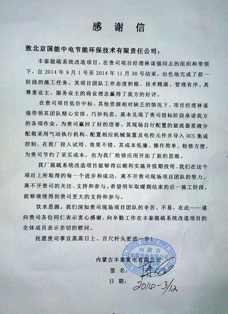內(nèi)蒙古豐泰脫硫系統(tǒng)改造EPC項(xiàng)目受業(yè)主表?yè)P(yáng)