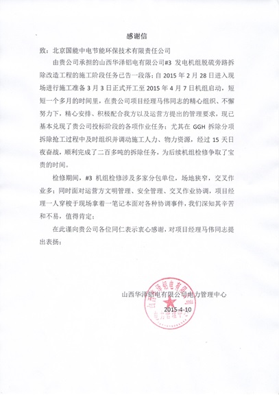 山西華澤鋁電旁路改造EPC項(xiàng)目受業(yè)主表揚(yáng)