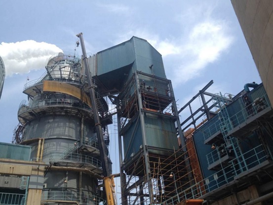 2015年5月1日11時16分,在業(yè)主、監(jiān)理、國能中電太倉項目部、施工單位以及相鄰國華太倉電廠業(yè)主的共同見證下,6#吸收塔增高施工當(dāng)天成功頂升圍板,這預(yù)示著協(xié)鑫太倉超低排放項目的建設(shè)進度更進一步。