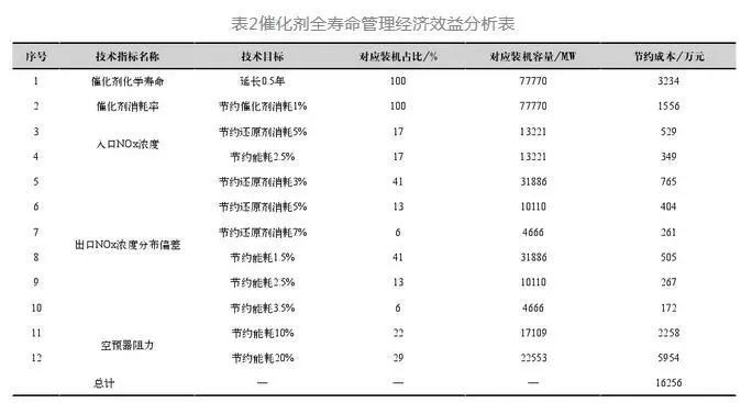 以某1000MW機組為例,假設能夠?qū)⒋呋瘎┗瘜W壽命由3年延長至3.5年、節(jié)約還原劑耗量5%、降低脫硝及空預器運行阻力300Pa,則可年節(jié)約催化劑成本50萬元、還原劑成本40萬元、能耗(水、電、汽耗)成本160萬元,總計可節(jié)約脫硝運行成本250萬元/年。假設國內(nèi)某發(fā)電集團192臺77770MW SCR脫硝機組催化劑統(tǒng)一實施全壽命管理模式后,基于當前運行現(xiàn)狀,通過折算對應裝機的催化劑采購成本、還原劑消耗成本、能耗成本,如表2所示,可節(jié)約脫硝運行費用約1.63億元/年。因此全壽命管理模式實施后,將能夠有效提升脫硝裝置運行可靠性、減少脫硝裝置運行成本。